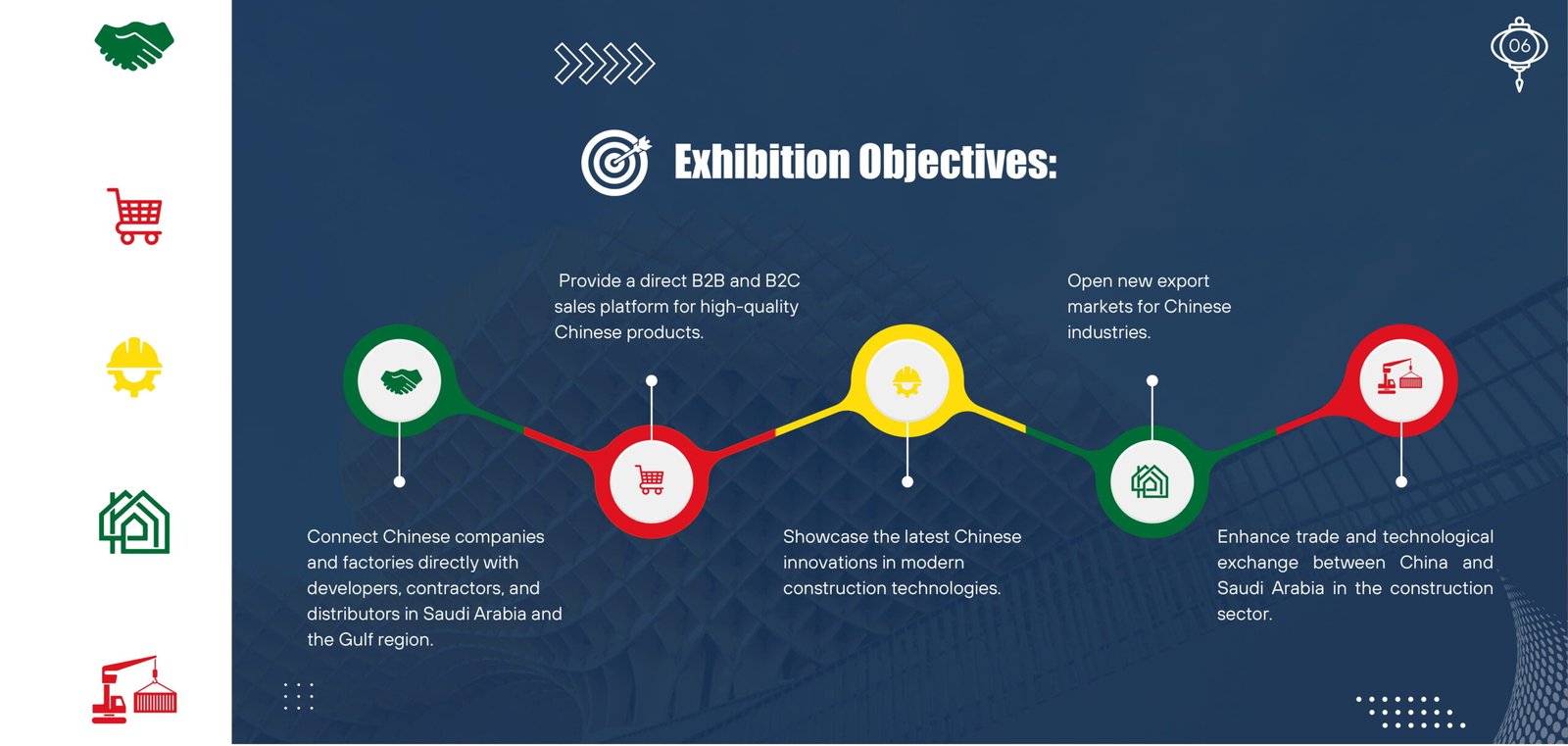 To become the leading trade bridge between top Chinese companies in the building materials industry and the Saudi and Gulf markets, supporting the growth of Saudi Arabia’s construction sector in line with Vision 2030, while promoting innovation and the development of modern infrastructure.